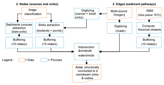 Considering sediment sources/sinks locations and pathways, structural connectivity can be mapped by using the geoprocessing chain in ArcGIS (Figure 4). By the successive use of intersect tools and watershed tools, nodes and edges can be spatially linked. Intersect tools are used here to connect different kinds of edges to nodes (i.e., headwater incision, gullies, streams, and rivers to sinks). Upland plots are considered to be the main sediment sources of the catchment. Field surveys demonstrated that the entire surface of the plots cannot be considered as being connected to the drainage network (Figure 5).