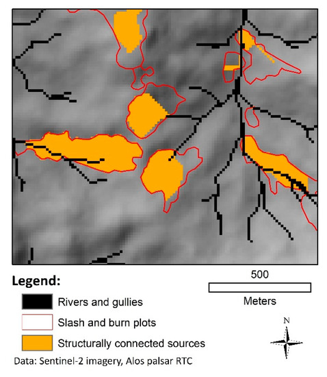 To identify the pixels connected to the network and to define the potential contributory areas, GIS watershed tools have been used to delineate the compartments that are structurally connected to downstream intersected edges within upland plots. These successive steps of GIS analysis and mapping must consider the accuracy and resolution of the dataset used. With 10 m resolution images and DEM, our delineation had to include a buffer margin around sources, sinks, and pathways. The threshold was defined to 15 m based on the empiric knowledge acquired through field observation, which helps to estimate the disconnection distance between a potential sediment source and the pathway as illustrated by Figure 6. This buffer zone goes beyond the unresolved issues regarding the ability of water and runoffs to overcome obstacles, such as a riparian zone [23], and the presence of rills and gullies in the plots, which easily overcome the presence of vegetation border protections around upland plots [22].