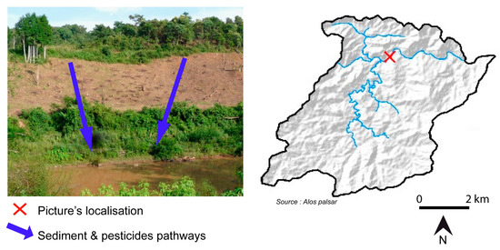 In the uplands, studies focusing on erosion issues have been conducted at the plot scale through interrill erosion [18,19] and at the small catchment scale up to 0.5–3 km2 [17]. They show that tillage, plant litter cleaning, and short fallow periods strongly increase the erosion and runoff processes [19,20]. Occurring on steep slopes, this explains a greater propensity to generate concentrate surface runoff, which contributes to rill erosion and to the development of gullies [1,17,21], thus increasing connectivity and sediment transfers [22]. Consequently, the roles of landscape mosaics or riparian forests in filtration, sediment trapping, and run-off are becoming less efficient on the steep slopes that characterise the uplands [17,20,23,24]. Under intensive cash cropping, these regions are identified as critical sources of sediments [17,21]. Furthermore, on the plots that have been cultivated over several years with short fallow periods, the villagers have come to develop new strategies to secure their livelihoods. Hoeing [21,25] and chemical inputs [26] are often needed to counteract soil fertility depletion. At the same time, the development of cash crop plots involves a chain process that increases the risk of pollution. Pesticides and herbicides are used to increase yields and reduce the time spent on hand-weeding [26,27], and feedback would enable the multiplication of cultivated plots to improve the agricultural work of households [28,29], especially on maize crops [3,4,7,27,30,31]. Moreover, on maize plots located in the uplands of northern Laos, herbicides (e.g., atrazine, glyphosate, paraquat, and Annexe1) are mostly used on bare soil at the beginning of the rainy season. Therefore, upland plots have become a potential source of pesticides resulting from diffuse agriculture pollution, soil erosion, and sediment transfers [32,33]. For example, recent studies conducted in Lao PDR have demonstrated that land use and erosion play a key role in the dissemination of microbiological pollutants linked with sediment flows [34,35]. They play a major role in bacterial contamination issues [34] in lowland paddy rice fields, especially during rice plantation by the villagers, who are potentially exposed to pollution. Many herbicides such as atrazine or paraquat are highly persistent in the environment. For instance, atrazine is not absorbed by soils, which leads to a high risk of ground and surface water pollution [36], while paraquat is strongly bent to soil particles, thus decreasing its bioavailability for degradation [37]. In both cases, these widely used herbicides are subjected to transfers in water (atrazine) or sediments (paraquat). This affects the soil as well as groundwater resources for a period ranging from a few days to several years, which explains the long-lasting release into certain river systems [38]. It also depends on environmental factors [39], and must have an impact on water quality and associated wetlands over the course of the spraying season, possibly even on a multi-year basis. Therefore, paddy rice fields and other wetlands such as ponds and rivers appear to be very sensitive to sediment and pesticide flows and represent a meeting point between the population and the pollution generated upstream.