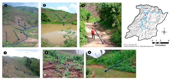 Example of the structural connectivity (blue arrows) with various connection types: (1) direct connection from plot to river; (2) hillslope hollow to ponds; (3) rills indicating a connection from a dirt road to the background upland plot; (4) gully connection in a steep upland; (5) irrigation ditch connection; (6) direct connection from upland grown with maize and a paddy field recently planted.