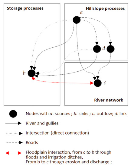 An oriented graph used to schematise these interactions (Figure 8) helps to distinguish sediment sinks and sediment outflow in the study area. Black edges refer to structural connections between sources and sinks. The red edge refers to a functional floodplain interaction between the river network and temporary sinks. Table 1 summarises the different types of connections deduced from the fieldwork (Figure 7) and their graphic formalisation (Figure 8). The connection classes are then used for connection mapping.