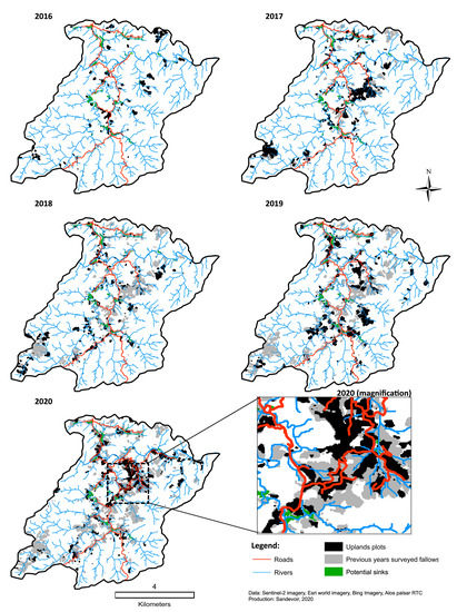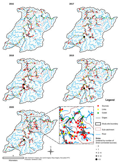 Our graphical analysis illustrates that 50% of the sinks are not directly connected to an upland plot, especially when no upland activities are conducted in the sub-catchments concerned. However, most sinks, i.e., between 94% (2017) and 85% (2016 and 2020), are connected to upstream rivers and gully networks for irrigation purposes and to upstream sources, if any. It is important to take this into account concerning the accumulation of pollutants, as irrigation occurs all along valleys where paddy rice fields are present [34,48]. The graph also highlights the sinks connected to a huge number of sources (>9 sources). These sinks are often at the outlet of a small head catchment, subject to shifting cultivation. Most of them are concerned year after year by an important number of connected sources, increasing their potential vulnerability to pollutants and sediment accumulation.