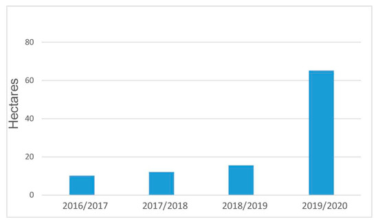 A total of 19% of the upland plots were cultivated under rotation over a period of 5 years (Table 5). The analyses confirmed the maize crop boom from 2016 to 2019 (Table 4), with a slightly shorter rotation period (Figure 10). It remains difficult to establish a statistical baseline for each crop, as upland rice and maize can be planted within a single plot. We observed a slow development of perennial plots which reach 17 ha in the studied area in 2019, but the development of sugar cane in 2020 changed the situation. Indeed, in 2019, sugar cane was often cultivated on lands that had previously been cleared for upland rice culture on the rounded ridge of the catchment. This explains why 65 hectares were cultivated both in 2019 and 2020, i.e., 20% of the total area cultivated (Figure 10). This transition, linked to the development of sugar cane, initiates a larger perennial use of uplands.