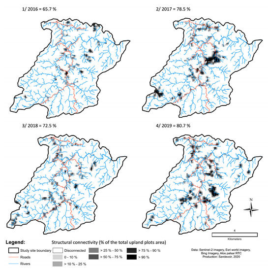 The structural connectivity (Figure 11) of upland plots was high, from 65.7% to 80.7%, and globally increased from 2016 onwards, with a peak in 2019, but it had an annual variability of around 20% of the total connected surface. The third connection class (Table 1), linking sources to outlets through rivers and gullies, appears to play a key role and reached almost 94% of the whole connected sources areas every year, with the exception of the year 2020 (Table 5). This dominance can be explained by the low extension of lowland sensitive areas and the low development of the road network, at least until 2019. Therefore, the potential diffuse pollution is mainly concentrated at the outlet of the system. The mean size of the plots seems to impact the connectivity rates. On the one hand, in 2016 and 2018 the mean size of the plots was about one hectare and the structural connectivity was dispatched in small plots, thus reducing the connectivity rate. On the other hand, in 2017 and 2019 the mean size of the plots increased largely, and the structural connectivity followed the same trend. In both cases, large plots, i.e., of more than 20 hectares, were present and often completely connected to downstream sediment sinks. In these cases, functional connectivity was probably higher as most of these plots reached structural connectivity rates of up to 90% (Figure 11).