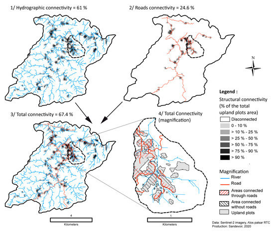 Structural connectivity did not increase in 2020 compared to 2019, while the upland area under cultivation increased by 11 hectares. The transition to sugar cane appeared to slightly diminish the connection rate. This might be due to the localisation of sugar cane plots on rounded ridges, while maize plots are located on lower slopes and rarely reach ridges. According to the villagers, this might be explained by the higher yields obtained downhill for this water- and deep-soils-demanding crop. As a result, maize plots appear to be more connected downstream. For sugar cane, it is mainly the proximity to the roads and the development of interfluve gentler slopes that determines the presence of cultures and explains the weaker connectivity rate. Regardless of this, structural connectivity rates concerning roads increased much faster than the length deployed, i.e., more than 100% in each of the three classes concerned (Table 6, classes 4, 5, and 6), for less than 50% of the road length increase. Consequently, it also appears that the development of the roads does not compensate for the total decrease in structural connectivity. In 2020, only 9.7% of the structural connectivity concerning roads was not linked to any other kind of connection (Table 6, classes 1, 2, and 3), which demonstrates the key role played by rivers and headwater incisions in structural connectivity rates.