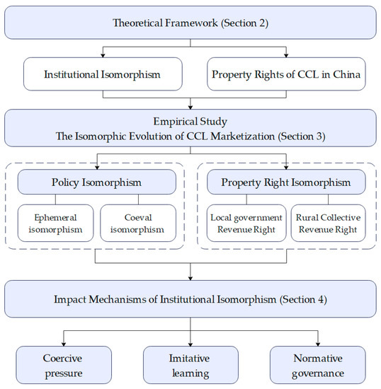 The remainder of the paper is structured as follows: Section 2 introduces the theoretical framework, including intuitional isomorphism and land property right theories. Section 3 shows the isomorphic policy and property right trend in two representative areas. In Section 4, we further analyze the influencing mechanism of multiple factors. After that, we further discuss the bi-directional oscillation of CCL institutional change and attitudes towards isomorphic trends in Section 5. At last, Section 6 is the conclusion of the paper.