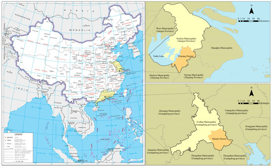 Shunde District belongs to Foshan Municipality, Guangdong Province, with a total area of 806 km2; Wujiang District belongs to Suzhou Municipality, Jiangsu Province, with a total area of 1177 km2, including 267 km2 of water area (Figure 3). They are located in the Pearl River Delta and Yangtze River Delta regions, respectively, which are at the forefront of China’s reform and opening up. They have similar stages of development, management authority, and reform goals to ensure comparability. In particular, since the 1990s, the rapid economic and social development of the two areas has repeatedly ranked among the top 100 counties (districts) in China, and they are representative areas of county economic development in China. Second, they have experienced the administrative evolution from county to municipal district. Third, they also faced similar problems at the beginning of the socialist market economy establishment, rapid industrialization, and urban regeneration.
