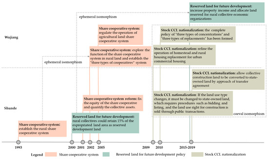 Regarding policy objectives and measures, the core of policy convergence between the two places is the ephemeral isomorphism represented by the reform of the shared cooperative system and the land reservation system and the coeval isomorphism represented by the renewal of the stock CCL nationalization (Figure 2).