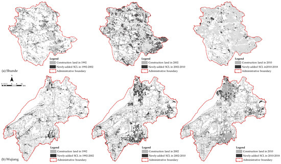 Spatial growth of state-owned construction land of Shunde and Wujiang in 1992–2018. (a). Shunde; (b). Wujiang.