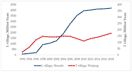 Collective-owned assets changes of L village in Shunde and T village in Wujiang in 1992–2018.