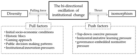 As can be seen, multiple pulling factors of institutional diversity still exist during the convergence in both places. These pulls come from initial socio-economic conditions, historical blocs, the way interest groups gaming, the forms of public decision-making, and the institutional innovation pressure of local governments, which shape the bi-directional oscillation of institutional evolution together with coercive, imitative, and normative push factors (Figure 7).