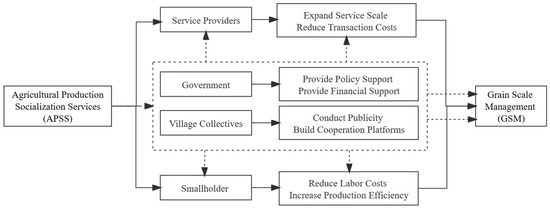 Firstly, it should be clarified that the entities involved in APSS include service providers, farmers, village collectives, local governments, etc. The cooperative and mutually beneficial mechanism among these entities is crucial in determining the smooth operation of APSS [27]. When each entity actively participates in APSS, it can objectively promote land consolidation. This paper will analyze the mechanisms by which each entity participates in APSS and promotes land consolidation based on their different interest demands.