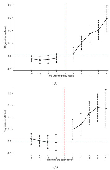 Among them, is a dummy variable, and is assigned to 1 if the difference between year t and the year selected for the APSS pilot area is k, otherwise, it is taken as 0. The values of k are between −5 and 4, and in this paper, all samples with k ≥ 4 are classified as k = 4, and all samples with k ≤ −5 are classified as k = −5, with k = −1 as the benchmark group. The rest of the meanings are the same as in Equation (1).