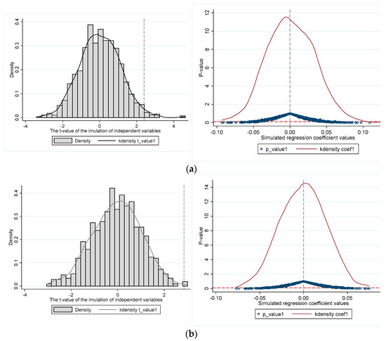 To further exclude the influence of other unknown factors on the selection of pilot areas and to ensure that the study findings obtained in the baseline regression are due to the pilot policy on APSS, a placebo test is required. The placebo test provides robustness to the original study findings by randomly selecting several dummy treatment groups in all samples for regressions consistent with the baseline regression. Specifically, in this paper, 1000 samples were taken from all 103 counties, 77 counties were randomly selected as the dummy treatment group in each sample, and the remaining 26 counties were regressed as the control group according to model (1). The results are shown in Figure 3. The kernel density distribution plots for both dependent variables show that the absolute value of the t-value of the estimated coefficients for the vast majority of the sampling is less than 1.96, the p-value is greater than 0.1, and the true estimates of the policy lie outside the distribution. This indicates that the policy had no significant effect on any of the 1000 random samples. Therefore, the conclusion obtained in this paper can pass the placebo test that the effect of APSS on GSM in the pilot counties is not significantly causally related to other unknown factors.