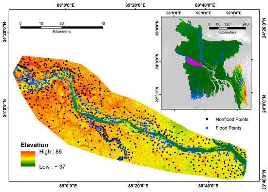 Flood events have been expected and frequent in Bangladesh during the past two decades, due to irregular rainfall patterns and climatic variabilities [32,33]. The western region of Bangladesh is particularly vulnerable to irregular rainfall or flooding caused by thunderstorm bursting, especially in the rainy season (June–September), causing major socioeconomic and human casualties [34,35,36]. Flood susceptibility (FS) refers to regions’ vulnerability to flooding due to regional geology, geography, and hydrometeorological variables. Using flood susceptibility models (FSMs), it is possible to divide an area into flood-prone zones and develop ways to protect against flooding. The FSM can be performed considering diverse tools, including a geospatial model, data mining techniques, deep and machine learning modeling, hydrologic and hydrodynamic modeling, and so on [37,38]. Among these tools, the uses of deep and machine learning models are frequently described in the existing literature for developing flood susceptibility analysis owing to their popularity and worldwide acceptance [39,40,41,42,43,44,45].
