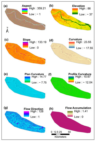 The 18 relevant attributes were assessed based on previous research [39,85,87,88] and the watershed features of the research location: aspect, elevation (m), slope angle (degree), curvature, plan curvature, profile curvature, flow direction, flow accumulation, land use and land cover (LULC), normalized difference vegetation index (NDVI), distance to the rivers (m), soil types, mean annual rainfall (mm), river density (RD), stream power index (SPI), topographic wetness index (TWI), sediment transport index (STI), and geology. Aspect usually defines the horizontal direction that an elevation’s slope is facing. Figure 3 shows details on the flood-causing agents. Elevation, slope angle, aspect, profile curvature, plan curvature, SPI, TWI, STI, river density, distance to the river, flow accumulation, and flow direction datasets were retrieved from an advanced land-observing satellite (ALOS)-based digital elevation model (DEM) with a resolution of 30 m. Based on past literature, the ALOS-based DEM was the most accurate way to develop the raster layers of these flood conditioning variables [4]. Based on data from [89] and [90], a map illustrating mean annual rainfall from 2000 to 2021 was created in a GIS environment by using kriging spatial interpolation tools (https://chrsdata.eng.uci.edu/) [89]. When the geospatial coverage of the sampling areas was inadequate, kriging interpolation was used for this purpose [91]. A map of LULC and NDVI was acquired from https://earthexplorer.usgs.gov/ [92]. Geological data (scale 1:100,000) was obtained from the United States Geological Survey (USGS) website [93]. The soil-texture-types map (scale of 1:5,000,000) was acquired from the Food and Agriculture Organization (FAO) of the United Nations (UN) [94]. It is worth mentioning that decreasing the uncertainties associated with different spatial resolutions is difficult. A constant grid size of 30 m was adopted to provide meaningful findings, so all causal factors were examined within this approach [95].
