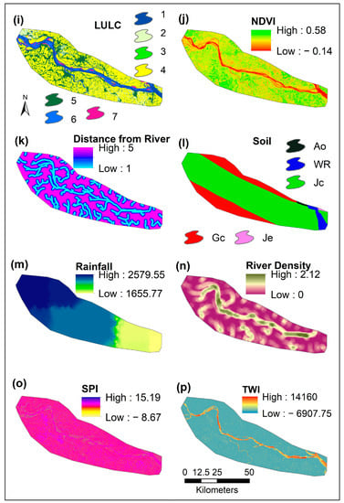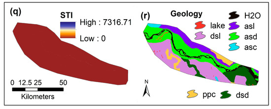 Flood susceptibility causal variables: (a) aspect, (b) elevation (m), (c) slope angle (degree), (d) curvature, (e) plan curvature, (f) profile curvature, (g) flow direction, (h) flow accumulation, (i) land use and land cover (LULC), (j) normalized difference vegetation index (NDVI), (k) distance to the rivers (m), (l) soil, (m) mean annual rainfall (mm), (n) river density (RD), (o) stream power index (SPI), (p) topographic wetness index (TWI), (q) sediment transport index (STI), (r) geology.