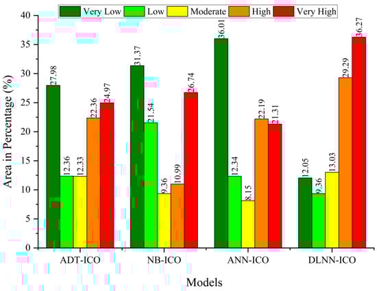 Mapping of FS in this basin is evaluated by utilizing the four ensemble learning algorithms (ADT, ANN, NB, and DLNN) with an ICO optimizer. Figure 4 depicts the resulting FS maps from the models, divided into five classes of susceptibility, and lists the areas and percentages of each type. The deep learning neural network–iterative classifier optimizer (DLNN-ICO) highlights highly vulnerable areas, whereas an artificial neural network (ANN-ICO) highlights less susceptibility. In contrast, ANN-ICO found very low susceptibility compared to DLNN-ICO. The areal coverages of very high and very low FS areas within the alternating decision tree–iterative classifier optimizer (ADT-ICO) model were 786.38 and 881.17 km2, respectively. The remainder of this watershed was connected to low, moderate, and high susceptibility zones, with the areal coverage of these zones being 389.25 (12.36%), 388.31 (12.33%), and 704.18 km2 (22.36%), respectively (Figure 4a). Although the whole region shows moderate to high susceptibility, the southwestern section of the watersheds is more susceptible. Naïve Bayes with the iterative classifier optimizer (NB-ICO) estimated 842.12 and 346.11 km2 as very high and high flood-prone zones, accounting for 26.74% and 10.99% of the total flood-prone area (Figure 4b). In the NB-ICO-based model, the very low class covers the highest area (987.93 km2 shown in dark green). By the ANN-ICO (Figure 4c) machine learning technique, the very low flood susceptibility class occupied the largest percentage (36.01) area. About 1134.06 km2 of the general areas have a very low flooding risk. Within this model, the low, moderately high, and very high classes each comprise 12.34%, 8.35%, 22.19%, and 21.31% of the area remaining. Among the four maps of susceptibility, the DLNN-ICO (Figure 4d) combination indicated a maximum area of 1142.25 km2 of very high flood susceptibility and 379.49 km2 of very low susceptibility. According to the DLNN-ICO map (Figure 4d), floods were more likely to be extremely severe in the southwest part of the basin. Besides that, the remaining areas are linked to low, moderate, and high flood-prone zones, with an aerial coverage of 294.77, 13.03, and 292.43 km2, respectively (Figure 5).