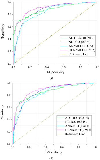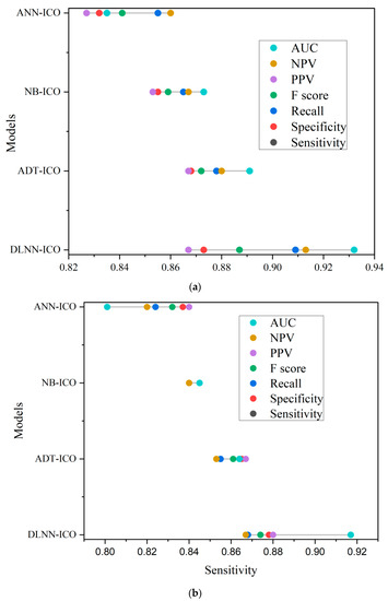 The training dataset’s sensitivity, specificity, recall, F score, PPV, and NPV value in the ADT-ICO model is 0.88, 0.87, 0.88, 0.87, 0.87, and 0.88, respectively (Figure 7a). In addition, the sensitivity, specificity, recall, F score, PPV, and NPV values of this model’s validation datasets (Figure 7b) are 0.86, 0.87, 0.86, 0.86, 0.87, and 0.85, respectively. The NB-ICO model training and validation datasets of sensitivity, specificity, recall, F score, PPV, and NPV values are (0.87, 0.86, 0.87, 0.86, 0.85, and 0.87) and (0.84, 0.84, 0.84, 0.84, 0.84, and 0.84) (Table 2). However, the validation datasets of the six parameters are 0.87, 0.88, 0.87, 0.87, 0.88, and 0.87, respectively, for DLNN-ICO.