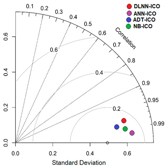 The Taylor diagram helps to compare the four models’ prediction abilities and identifies the most suitable one [99]. In terms of ideal capacity, DLNN-ICO performed best, followed by ADD-ICO, NB-ICO, and ANN-ICO (Figure 8). Convergence of the objective cost function in the ICO-DLNN model is shown in Figure 9. It clearly depicts the optimal nature of the predictive model in FS assessment. It determines and expresses as a single real number the difference between the projected value and expected value. The results of the optimal model (ICO-DLNN) show that costs decrease as the number of iterations increases (Figure 9).