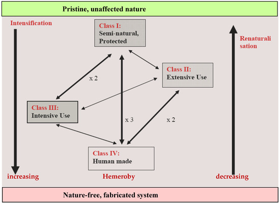Eurostat defines hemeroby, in a more simple way, as the magnitude of the deviation from the potential natural vegetation caused by human activities (https://ec.europa.eu/eurostat/statistics-explained/index.php?title=Glossary:Hemeroby_index, accessed on 30 March 2023). More specifically, Kowarik distinguishes ‘closeness to nature’ from hemeroby [33]. The former takes the original, culturally still-uninfluenced, state as its reference point, although it can only be reconstructed by making a variety of (sometimes heroic) assumptions. The latter, hemeroby, takes the potential vegetation and fauna of the site that would develop when human influence ceases and self-regulation takes place as its reference point. Both can be considered to be interpretations of the term ‘naturalness’. Hence, hemeroby can be understood as an inverse measure of naturalness if anthropogenic interventions are reversible [29]. In plant ecology, the hemeroby index is widely used to characterise the anthropogenic disturbance level of a habitat, but is also applicable, e.g., to the bird populations nesting or feeding in the disturbed areas [24]. However, it does not address the anthropospheric complexity, providing no policy and economic analysis, which has motivated authors such as Erb et al. to suggest even more complex measurement systems, including input, output, and system structure [34,35]. On the other hand, when Hill et al. analysed biodiversity in urban England, they found the hemeroby index possible to calculate, but too complicated for their purpose [36]. They suggested to use a set of simple indicators, such as share of neophytes, which can be an appropriate solution if a strong correlation with the higher level index can be demonstrated.