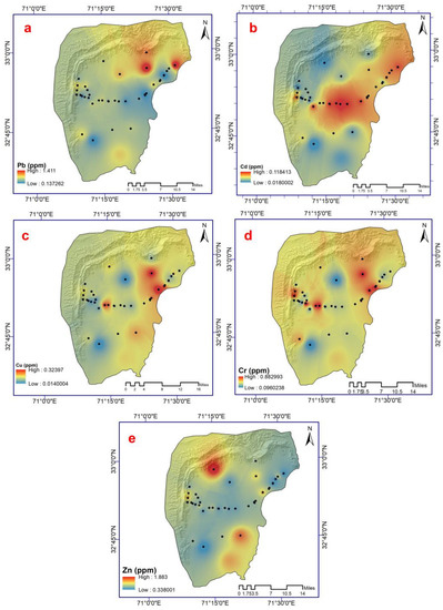 The geospatial analysis showed that most of the movement and distribution of TTEs in the Makarwal region were in the middle (Figure 3). However, the concentration of TTEs in the soil affected by coal waste was higher than in the background area. Additionally, the concentration of TTEs was also higher nearby the dumping region as well as on the road at a distance from the coal mining vicinity (Figure 3). The concentration of lead was high far from the coalmine region, where the rocks mostly belong to Triassic Ceratite and have lead-bearing minerals as compared to the coalmines [46] (Figure 3). Similarly, the concentration of Cd was high in the Makarwal Plain areas, which are considered sinks.