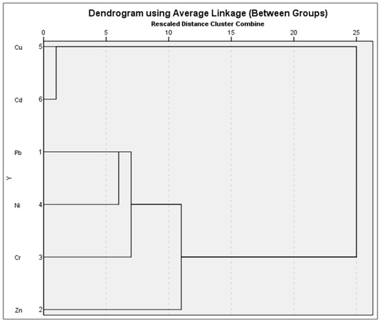The FA results were further supported by hierarchical analysis. The clusters can be distinguished in the dendrogram-analyzed parameters with the average linkage method and the squared Euclidean distance as a similarity measure (Figure 4). Factor 1 was loaded with elements, namely, Cu and Cd, as the variability of these elements was controlled by parent rocks. However, factor 2 consists of Pb, Ni, Zn, and Cr, which were identified as contaminants derived from parent rock material characterized by sand and limestone. The result of the present study is consistent with that of Danilchik and Shah [46]. The loaded element’s contents in F2 were similar to cluster 2; i.e., Pb, Ni, Cr, and Zn, while cluster 1′s load was similar to F1 (Figure 4), which proved that the contamination in the surrounding areas is associated with the parental rock of the Makarwal coalfield.