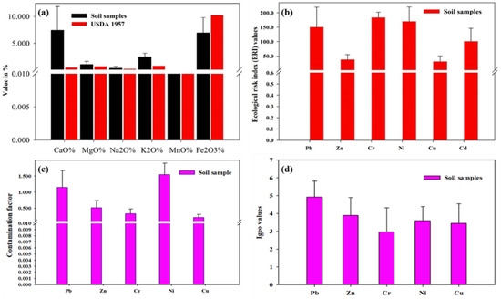Figure 5. (a) A comparison of major oxides with the normal soil concentration of USDA [50]; (b) potential ecological risk of trace elements in Makarwal soil; (c) contamination factor of Makarwal coal-mining-contaminated soil; (d) geoaccumulation index of Makarwal coal soil.
