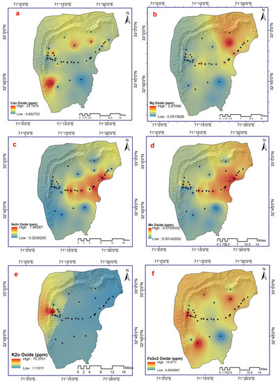 Figure 6. Concentration distribution maps of the major oxides (a) CaO, (b) MgO, (c) Na2O, (d) MnO, (e) K2O, (f) Fe2O3 in the soil samples of the study area.