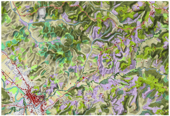 Even the more traditional forms of knowledge used in planning were questioned, innovated, and recombined, and the same was conducted for cultural heritage databases, natural protection areas, morphological analysis (see Figure 1, Figure 2 and Figure 3), and many other aspects. An example that clearly illustrated the general effort exerted on this regard is the one for the landscape plan of Tuscany [19].