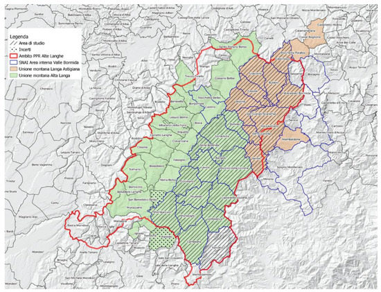 Upper Val Bormida Valley is part of the Alta Langa municipalities union (in green color); part of this area (the one with blue stripes) has been the object of a specific strategy for marginal areas. The red line identifies the specific area designed by the Regional Landscape Plan. The pilot research area here described corresponds to the blue striped area inside the red line. Legend: Area di studio: Study area; Incerti: Uncertain; Ambito PPR Alte Langhe: PPR Alte Langhe area; SNAI Area interna Valle Bormida: SNAI internal area of the Bormida Valley; Unione montana Langa Astigiana: Langa Astigiana mountain union; Unione montana Alte Langa: Alte Langa Mountain Union.