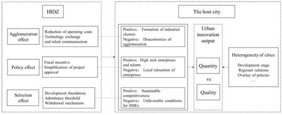 Based on a literature review, a conceptual framework is proposed (Figure 1), summarizing the impacts of HIDZs on the quantity and quality of urban innovation. Through the combination of agglomeration effects, policy effects, and selection effects, HIDZ policy has influenced the spatial layout of various innovation entities in cities and regions, gathering a large number of scientific research institutions and large enterprises within the boundaries of the HIDZ. Existing research has shown that large-scale infrastructure investment in the early stages of development zone construction, as well as the improvement of technological service facilities during the development process, will greatly reduce the operating costs of various market entities, enabling innovative entities to gather in or around the HIDZ [27]. This feature can not only promote cooperation and competition between enterprises of the same type, but can also achieve knowledge spillover and personnel exchanges between different types of enterprises, and may promote the formation of local innovation ecosystems [7]. Under the influence of the above multiple effects, HIDZ is also seen as a growth pole that promotes economic growth and social development in cities and regions [24], driving the cities where it is located to produce more innovative results, and significantly improving the quality of innovation, thereby winning in the urban competition in the region. In addition, due to differences in regional layout, development stages, and overlapping industrial policies, the impact on urban innovation of setting up HIDZ in different cities is also different.