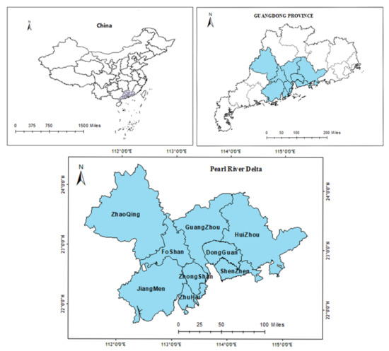 In this study, the study area chosen is the region of the Pearl River Delta (PRD). It is located in the southern coastal area of China and is one of the three most productive economic regions of China [23,24], contributing up to 8689.9 billion yuan to GDP in China, which makes up around 80% of the total GDP in Guangdong Province in 2019 (National Statistics Bureau of Guangzhou 2020).