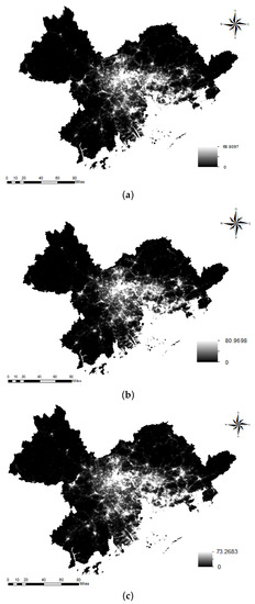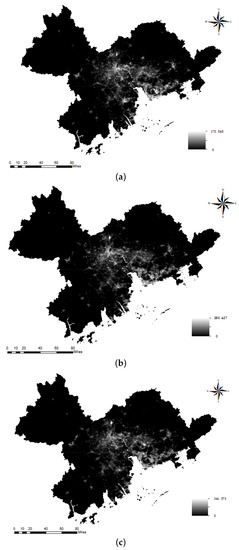 The problems of lower spatial resolution and shorter radiometric detections in applying DMSP/OLS NTL data have led to attempts to use NPP-VIIRS NTL data ever since 2013 [25]. VIIRS performs very well in calibration and validation and can detect night-time lights spanning from 75° N to 65° S with the radiation from 3 nW·cm−2·sr−1 to 0.02 W·cm−2·sr−1 [26]. Suomi-NPP provides sensor data records, including data on clouds, sea surface temperature, and so [27]. Furthermore, the DNB (Day/Night Band) is a component of the VIIRS instrument onboard Suomi-NPP, which makes it possible to observe satellite night in the visible spectrum. As a new generation of night-time products, NPP-VIIRS enables scholars to collect daily, monthly and annual data from 2013 to 2019. Specifically, NPP-VIIRS NTL data of the PRD for the years 2013, 2016, and 2019 (see Figure 2) are collected in this study to track the changes in HVRs.