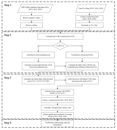 The main process in this research can be divided into four main steps, as illustrated in Figure 3. Step 1 involves data pre-processing to gain each pixel’s urban area ratio (UAR). This includes denoising NTL data and resampling urban built-up area data. Step 2 calculates UAR and removes non-residential lights from the light value. With the light value of each NTL pixel, Step 3 derives the HVR of each pixel by comparing the estimated light value and the largest light value. Measures are also applied to evaluate the links between changes in HVRs in different districts. Finally, this study uses the housing rent/sale information to calculate the real HVRs and to verify the HVRs estimation, a task performed in Step 4.