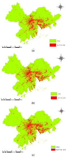 We regard construction land as a built-up area and water area, green fields, and cultivated land as constituting other categories of land use. The classified outcomes can be obtained and divided into two parts, the built-up area and the other area, based on the Bayes classification method, which classifies the remote sensing image. The urban built-up areas of the PRD for 2013, 2016, and 2019 have been extracted and shown in Figure 5.