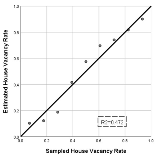 There are two commonly used methods for accuracy verification: one is to compare the estimated value with the actual measured value [18]; the other is to compare the estimated result with the results obtained by others in the same area using other methods [34]. Unfortunately, none of these data are available for Chinese cities. As an alternative, this study used the ratio of the number of housing units on sale or for rent to the total number of housing units in one district to characterize the housing vacancy level in the district. The sample HVR could thus be calculated with Formula (4).