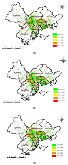 HVRs at district scale in the PRD. (a) 2013, (b) 2016, (c) 2019.