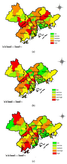 Looking into the PRD, HVRs have never been evenly distributed. As shown in Figure 8, we separated the districts into five groups: low, mid–low, medium, mid–high, and high. We performed this by calculating and dividing the average HVRs of all districts. The cities located west of the Pearl River Estuary had more districts with high HVRs. Especially in the cities of Jiangmen and Zhongshan, the HVRs in most districts continued rising in these 6 years studied. Together with the completion of the Humen Bridge in 1997 which linked the west and east banks of the Pearl River Estuary, the real estate market believed that citizens in rich east bank cities such as Dongguan and Shenzhen would invest and even inhabit in the west bank. This resulted in the development for irrational speculation in west bank cities. Speculation could at times also focus on one district in a city. For example, the housing vacancy situations in the city of Zhaoqing were found to be relatively healthy. The exception was the District of Huaiji, with this indicating an oversupply of real estate in this isolated county compared with its limited population. Similarly, the HVR of Boluo County in Huizhou increased dramatically from 2016 to 2019, from 0.16 to 0.43. This may be due to the speculation incentives stemming from the spillover of housing needs in Shenzhen and Dongguan.