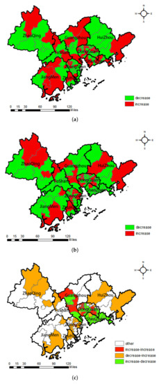 Spatial distribution of HVRs changes in the PRD. (a) 2013–2016, (b) 2016–2019, (c) 2013–2019.
