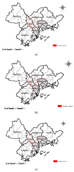 Spatial distribution of vacant pixels in the PRD. (a) 2013, (b) 2016, (c) 2019.