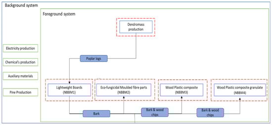 To meet the increasing demand for woody biomass in an emerging bioeconomy, short rotation coppices (SRC) are proposed as a promising opportunity. Fast-growing tree species such as poplar are cultivated in high stock density on agricultural land, to produce woody biomass within very short rotation periods (five to ten years) using fully mechanized harvesting. Wood biomass originating from such cultivation is called dendromass [48]. The European-funded project Dendromass4Europe (2017–2022, Horizon 2020 BBI-IA-DEMO, BBI JU Grant Numbers 745874) supported the establishment of 1285 ha SRP on marginal agricultural lands in Slovakia and demonstrated the valorisation of the dendromass into four value chains. With the complete harvest of dendromass, the following new bio-based materials (NBBM) were produced: lightweight boards (NBBM1), moulded fibre packaging (NBBM2), wood plastic composite terrace decking (NBBM3), and bark-enriched granulate for injection moulding (NBBM4) (see Figure 1).