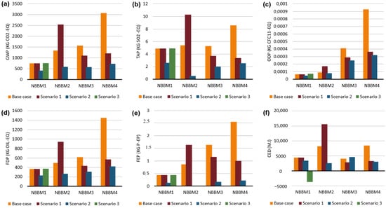 (a) Global warming potential, (b) terrestrial acidification potential, (c) ozone depletion potential, (d) fossil depletion potential, (e) freshwater eutrophication potential, and (f) cumulative energy demand of NBBMs in four scenarios.