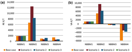 The eco-efficiency based on value added in the base case cannot be illustrated (Table 6), because there is no value added in NBBM3 and NBBM4—value-added-based eco-efficiency is not applicable. Conclusions on eco-efficiency differ depending on scenario and impact category.