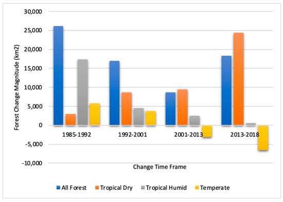 Trade liberalization in Mexico and neoliberal reforms more generally have tracked an autonomous process of agricultural intensification, which began with the green revolution in the 1960s with new varieties of wheat and maize. Also in evidence is a multidecadal process of land cover dynamics. An examination of total forest change magnitudes at a national scale reveals overall declines in deforestation rates through much of the time period until 2013, when rates began to rise once again (see Figure 1). The rate of deforestation between 1985 and 1992, 0.53% yr−1, declined to 0.11% yr−1 for the period 2002–2014. Of particular interest for this study are the forest cover dynamics revealed when the data are disaggregated by forest biomes. As the figure shows, deforestation rates in tropical humid biomes have steadily declined throughout the time period, and an apparent FT is underway in Mexico’s temperate forests, which increased their extent from 341,805 km2 in 2002 to 351,562 km2 in 2018, for an annual rate of transition of 610 km2 yr−1. Unfortunately, deforestation rates in tropical dry biomes show a pronounced rise across the time period, a trend that parallels deforestation patterns across the global south [18,43,44]. The dramatic and continually high deforestation rates in tropical dry biomes clearly explain the total deforestation rate trends on a national scale.