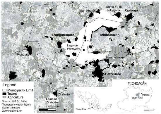 The present study addresses a specific case of a temperate FT, one occurring in the Patzcuaro Lake watershed (PLW) in the state of Michoacán, Mexico (see Figure 2). The PLW is part of the Purhépecha Indigenous Region, and, like many other parts of rural México, human settlement at this site is ancient, dating back more than 5000 years [46]. The watershed, covering ~1000 km2 [47], drains into Pátzcuaro Lake, with a surface area of 130 km2 and a 4.9 m mean depth [48]. The regional geomorphology is dominated by volcanic mountains, inter-mountainous valleys, piedmonts, and hills, with elevations ranging from 2035 m.a.s.l. at lake level to 3400 m.a.s.l., the altitude of the highest mountain [47]. The PLW possesses a mild, temperate climate, with an average annual temperature of 14.5 °C and an average rainfall of 1000 mm-yr−1 distributed mostly from June to October. Soils are of volcanic origin and are mostly fertile. Ecology is dominated by the temperate forest biome, consisting primarily of a mixed pine–oak forest. Fir trees (Abies religiosa) are found in the high elevations, while pine (Pinus pseudos-trobus, P. michoacana, and P. montezumae) and oak (Quercus rugosa, Q. castanea, and Q. laurina) grow on the wide slopes of the mountains. Lower elevations are covered by grasses and secondary herbaceous vegetation, presumably of anthropogenic origin [48].