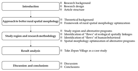 The inadequate consideration of livable rural spatial morphology in rural planning has impeded the further advancement of the rural social system, resulting in a challenge for rural residents to establish an appealing living experience that distinguishes itself from urban areas. This situation calls for an urgent exploration of livable spatial morphology based on human-centered principles, as well as an investigation of planning spatial morphology optimization mechanisms that consider ecological backgrounds and human settlement needs. In response to this issue, this study employs the theory of flow space and constructs a framework for the optimization of rural spatial methodology. By integrating ecological and sociological analysis methods, the study identifies the “flow” structure of spatial association in rural ecosystems through ecological network analysis, and identifies the “flow” structure of behavioral association in rural human systems through social network analysis. Based on these findings, the complex network morphologies are evaluated and screened. To test the effectiveness of this framework, the study examines the spatial morphology of four planning options through case empirical analysis in Zepan Village, Hebei Province, China. The research results demonstrate that the framework can help achieve the goal of optimizing rural spatial morphology, improve existing planning practices that prioritize single plans and disregard the selection of multiple plans, and serve as an effective tool to aid planners in tackling complex planning problems by balancing scientific principles and empirical values.