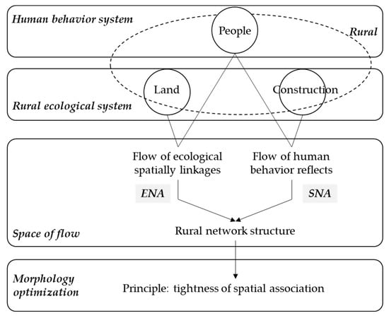 The space of flow theory emphasizes that the “flows” generated by the trajectories of human production and living activities in spatial morphology form a spatial field resembling a network. In rural regions, the “flow” that occupies the most space is the spatially connected “flow” of ecosystems. The ecological spaces in rural areas constitute the spatial network of rural ecosystems, as opposed to the isolated ecological spaces in urban areas. The continuous ecological spaces in rural regions morphology a densely interconnected ecological network that enables rural ecosystems to maintain stability and adapt to external disturbances, thus forming a distinctive rural landscape [44]. According to this perspective, it is not just the number of ecologically functional spatial resources, such as woods, rivers, and green spaces, that are scattered throughout rural areas that is important, but also whether these ecological spatial resources can maintain well-functioning ecosystems through connections. Rural areas have developed a spatial morphological identity that is difficult to replicate in urban areas [45]. On the other hand, the “flow” of human behavior reflects the daily production and life trajectory of rural residents. Although for the ecosystem, human activities are more reflected as “interference”, rural residents should enjoy convenient, safe, and comfortable production and living facilities and services as urban residents. In light of the above, this article puts forth a proposed assessment framework to evaluate the value of rural spatial morphology (refer to Figure 2). The framework is composed of three main components. Firstly, the triadic relationship between the human behavior system and the rural ecological system within rural space is analyzed. This analysis involves examining the interplay between human behavior, land, and architecture. Secondly, the logical characteristics of the spatial association flow of the natural system and the behavioral association flow of the human system are identified through the use of ecological network analysis (ENA) and social network analysis (SNA). These analytical methods are employed separately to recognize the logical features of each association flow. Finally, the evaluation is conducted based on the principle of tightness of spatial association.