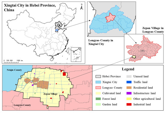 Zepan Village is located in the middle of Dongliang Town, Longyao County, Xingtai City, Hebei Province, China. Zepan Village covers an area of 1244.11 hm2, with a resident population of 8745 and an annual per capita income of about RMB 6000. The village has a flat topography, completely dominated by a plain, and about 90% of the land is agricultural land. Rice and lotus roots are the primary crops in the area, and the secondary businesses consist primarily of lotus root processing and rubber processing (see Figure 3).