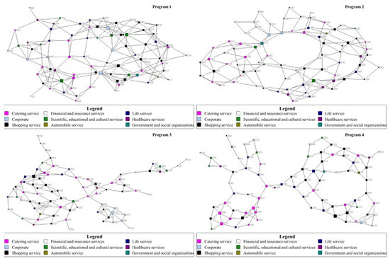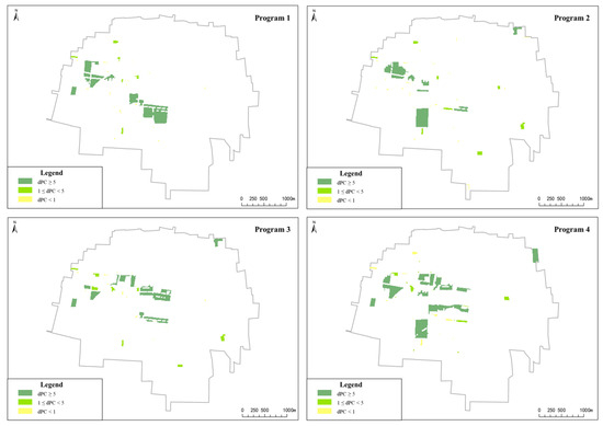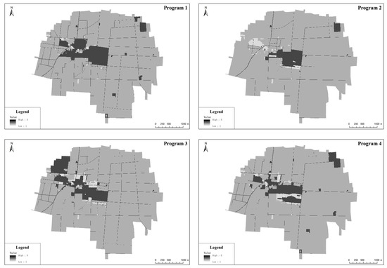The data were collected during the author’s participation in the drafting of village-level planning in Zepan Village. Based on the village’s basic data (including land, economy, people’s livelihood, infrastructure data, etc.), villagers’ wishes, and upper planning arrangements, several categories of development scenarios are formed. Distinct disparities exist in the diverse land use scenarios within these development frameworks. In order to concentrate on the fundamental research subject of spatial morphology optimization, the NSGA-II genetic algorithm was employed to filter the assorted quantitative structures and identify four of the Pareto optimal programs. These four programs served as alternatives for optimizing spatial morphology. In addition, Baidu Map POI data are used to determine the infrastructure service points within the village, including corporate, healthcare services, shopping services, catering services, etc. Based on the four categories of development scenarios, four alternative planning programs with the same quantitative structure were created as evaluation objects to prevent the influence of varied scales of various resource elements (see Figure 4).